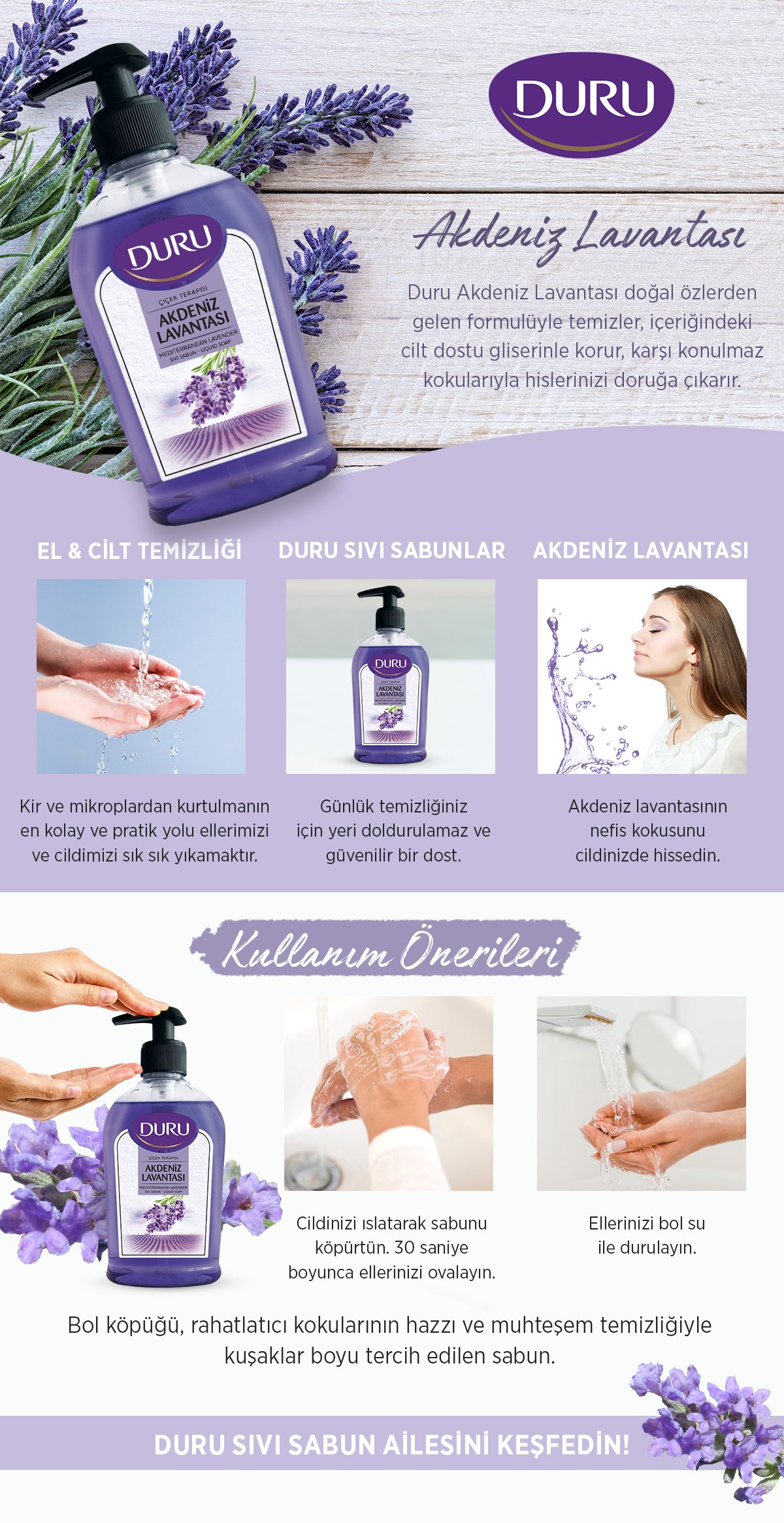 Duru sabunlar %100 bitkisel içeriğe sahiptir. Güçlü formulüyle cildinizi hem kirden arındırır hem de cilt dostu gliserinle korur. Tam 90 yıllık geçmişiyle Türkiye'de ve Dünya'da en çok tercih edilen sabun markalarından biridir.