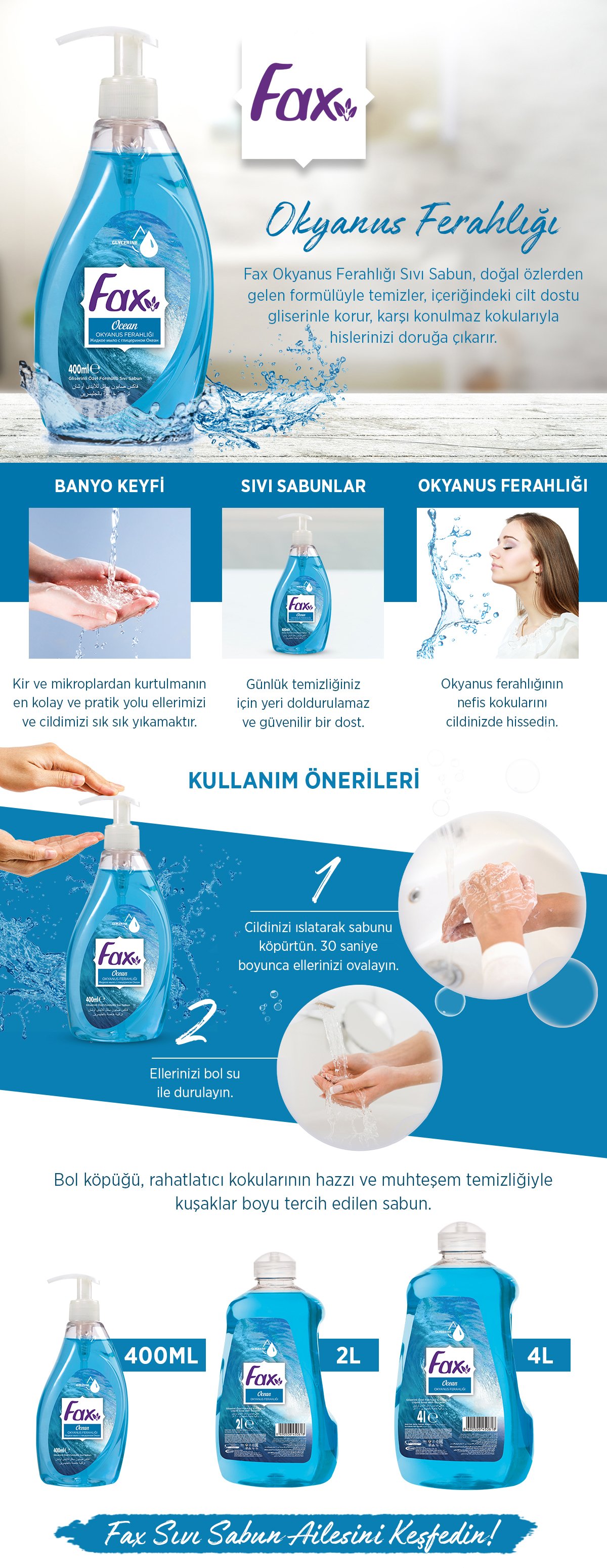 Aileniz için, en doğru seçim! Kirden arındırır, hoş kokulu, günlük kullanım için uygun. Banyoların vazgeçilmez ürünü Fax sabunlar, tüm çeşitleriyle banyo ve el hijyeninde ekonomik çözümünüz. Fax sabunlar özel formülü sayesinde cildinizi temizler, yumuşacık, pürüzsüz ve ışıl ışıl yapar. Hoş ve kalıcı kokularıyla teninizde uzun süren parfüm etkisi bırakır.