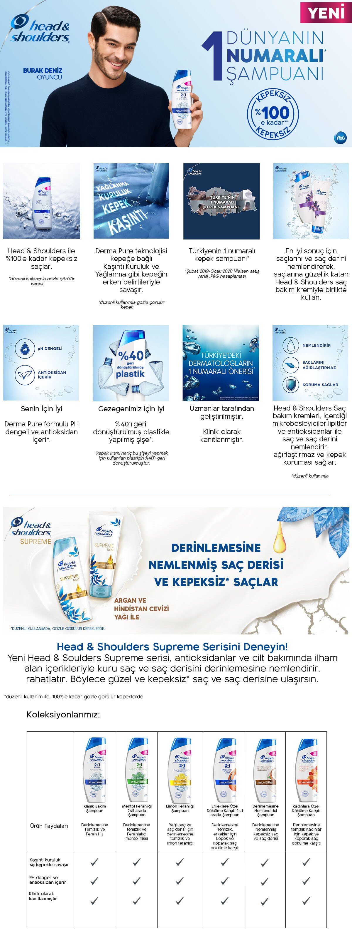 Head & Shoulders Klasik Bakım Kepeğe Karşı Etkili Şampuan, kepeğin ana sebebini hedefler, kepek, kaşıntı ve kuruluğa karşı 72 saate kadar koruma sağlar. Gelişmiş formülü dermatolojik olarak test edilmiştir, pH dengelidir, hassas saç ve saç derisi bakımı için antioksidanlarla güçlendirilmiştir (gözle görülür kepeklerde, düzenli kullanımda). Klasik Bakım Kepeğe Karşı Etkili Şampuan, saçınızı temizler, ferahlatır ve nemlendirir. %100’e kadar kepeksiz saç ve saç derisi. Dünyanın 1 numaralı şampuan markasıdır (P&G’nin şampuan kategorisindeki yıllık dış satışlarına bağlı hesaplama). En iyi sonuç için, saçlarını ve saç derisini derinlemesine nemlendirerek, saçlarına kepeksiz güzellik katan Head&Shoulders saç bakım kremi ile kullanabilirsin. %40’ı geri dönüştürülmüş plastikle yapılmış şişe (kapak kısmı hariç, bu şişeyi yapmak için kullanılan plastiğin %40’i geri dönüştürülmüştür).